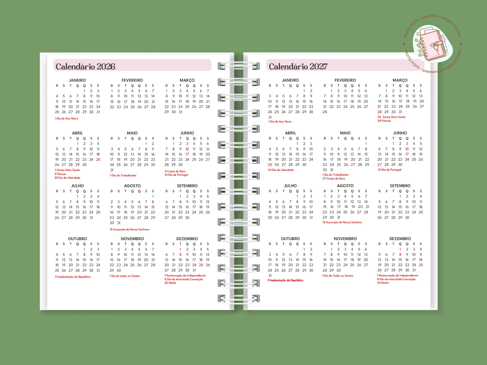 • Calendário 2026 e 2027 com feriados marcados