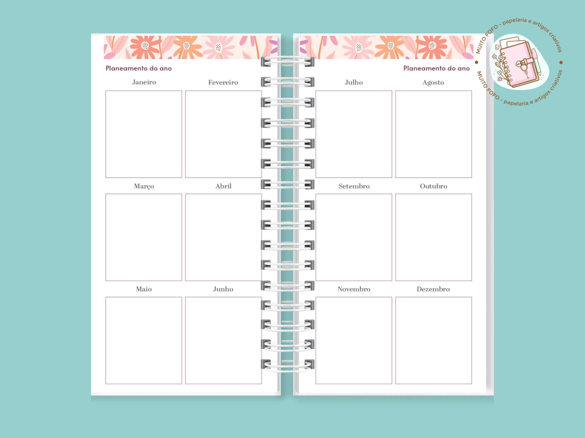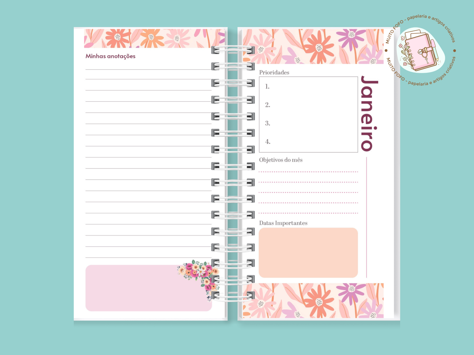 • Páginas mensais com prioridades, objetivos do mês e datas importantes