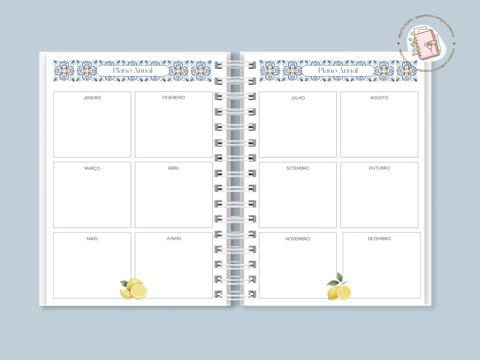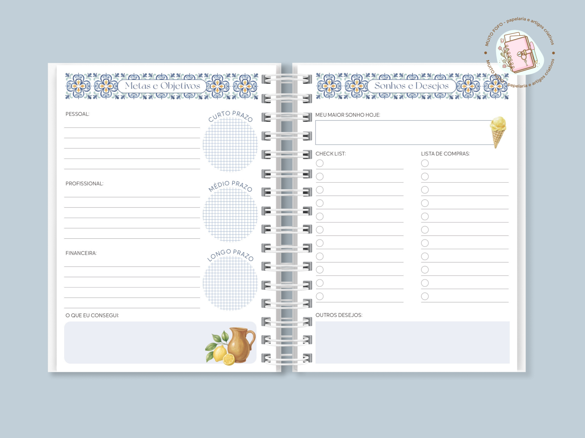 • Secções de contactos importantes, plano anual, metas e objetivos, sonhos e desejos