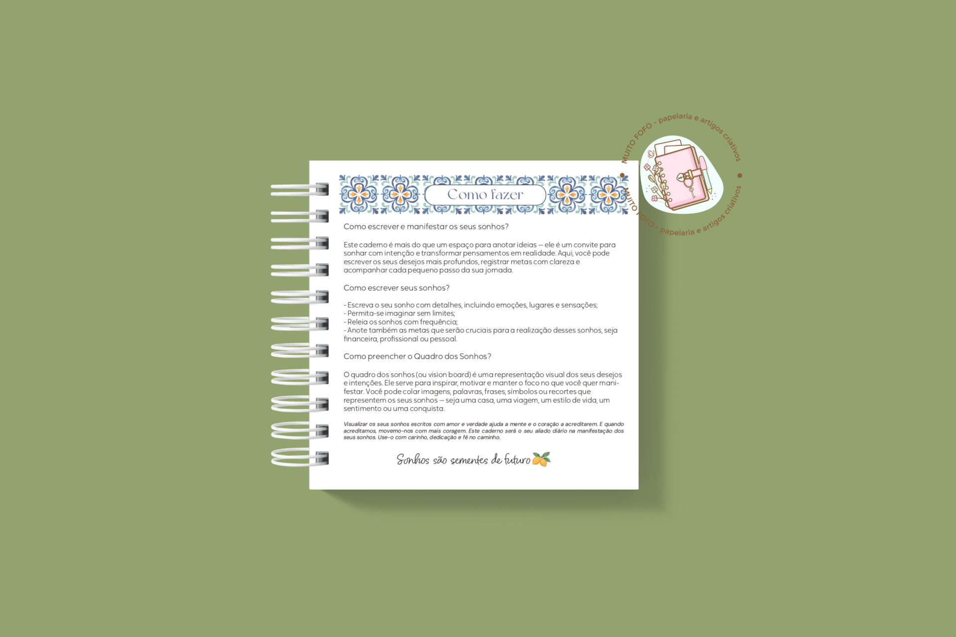 No interior, encontrarás espaços dedicados a registar os teus sonhos, metas e intenções, além de um guia inspirador para te ajudar a manifestá-los com clareza.