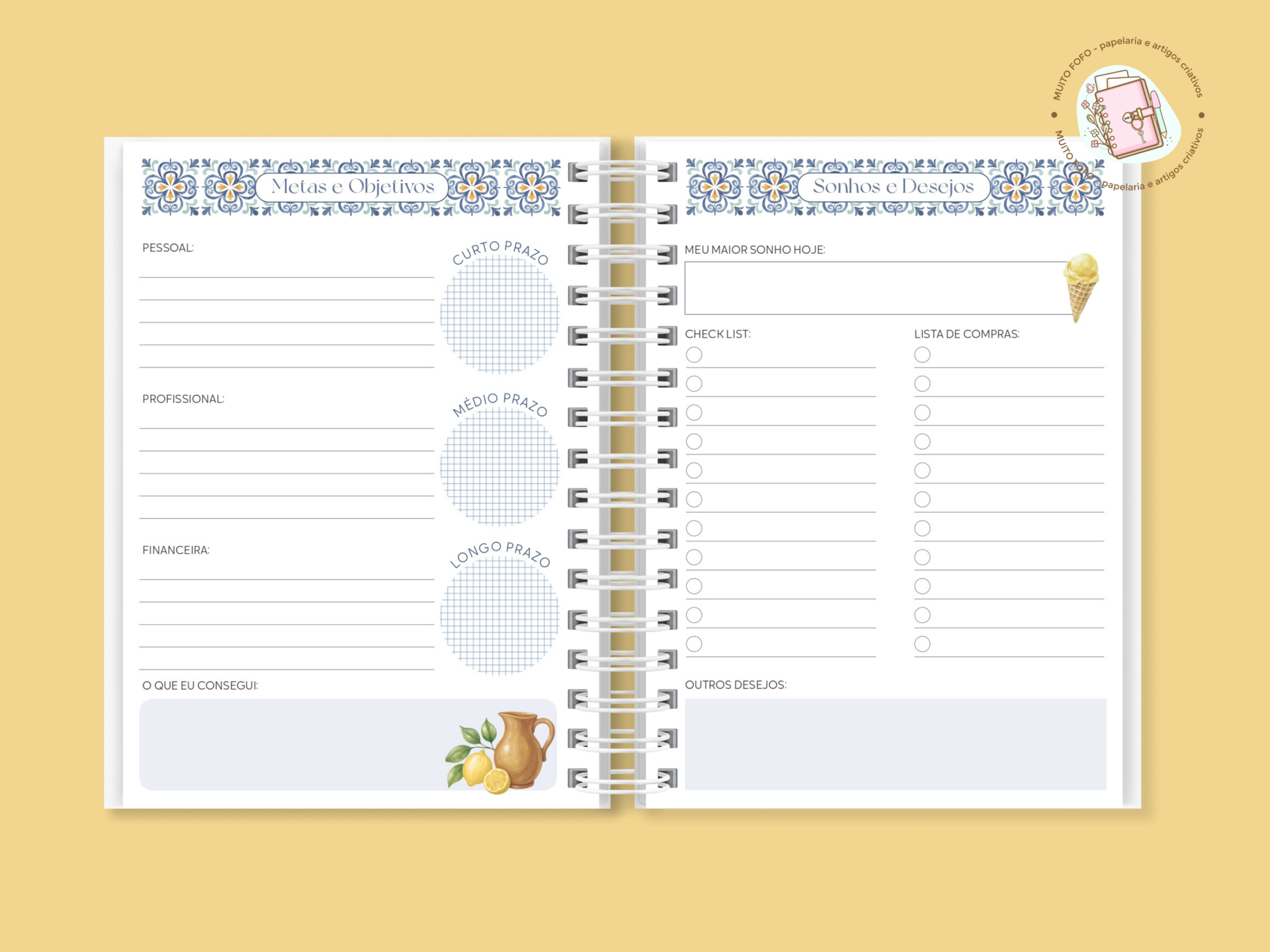 • Secções de contactos importantes, plano anual, metas e objetivos, sonhos e desejos