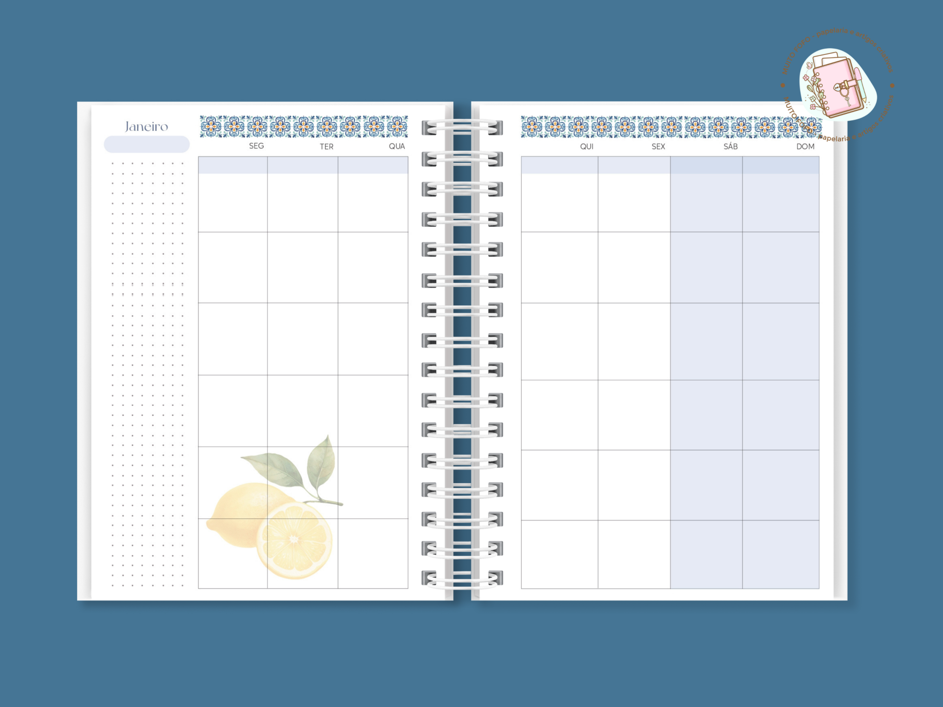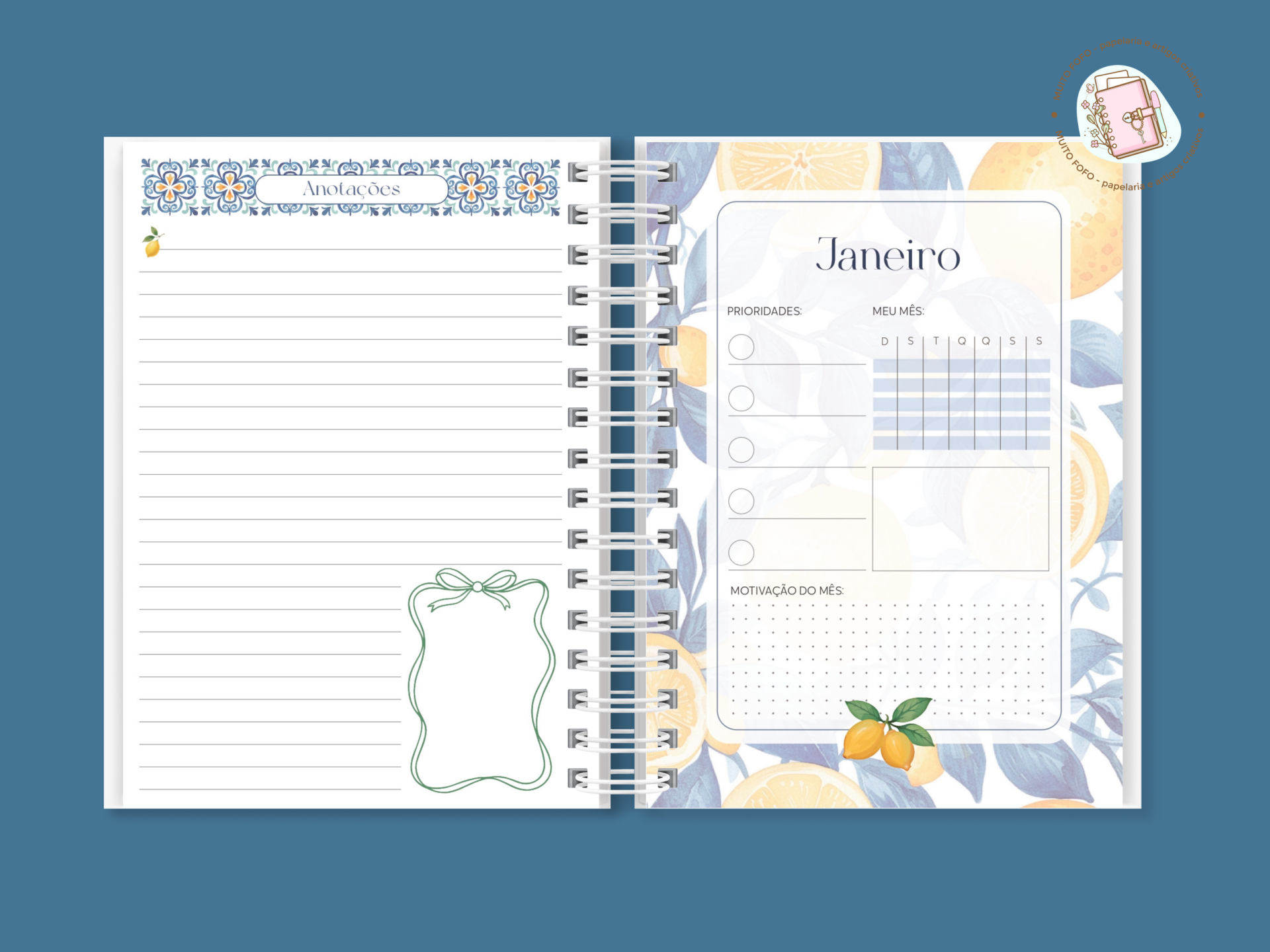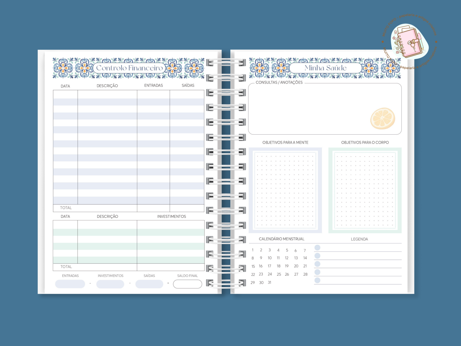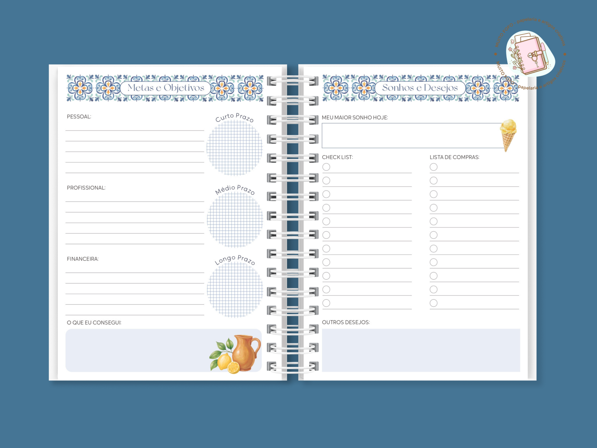 Com capa rígida resistente, acabamento artesanal e design exclusivo, este planner une funcionalidade e beleza em cada página.