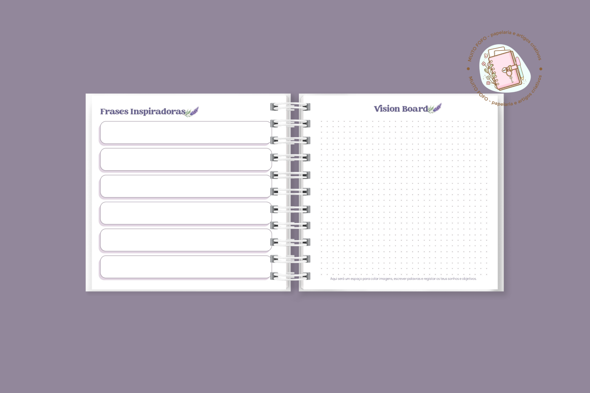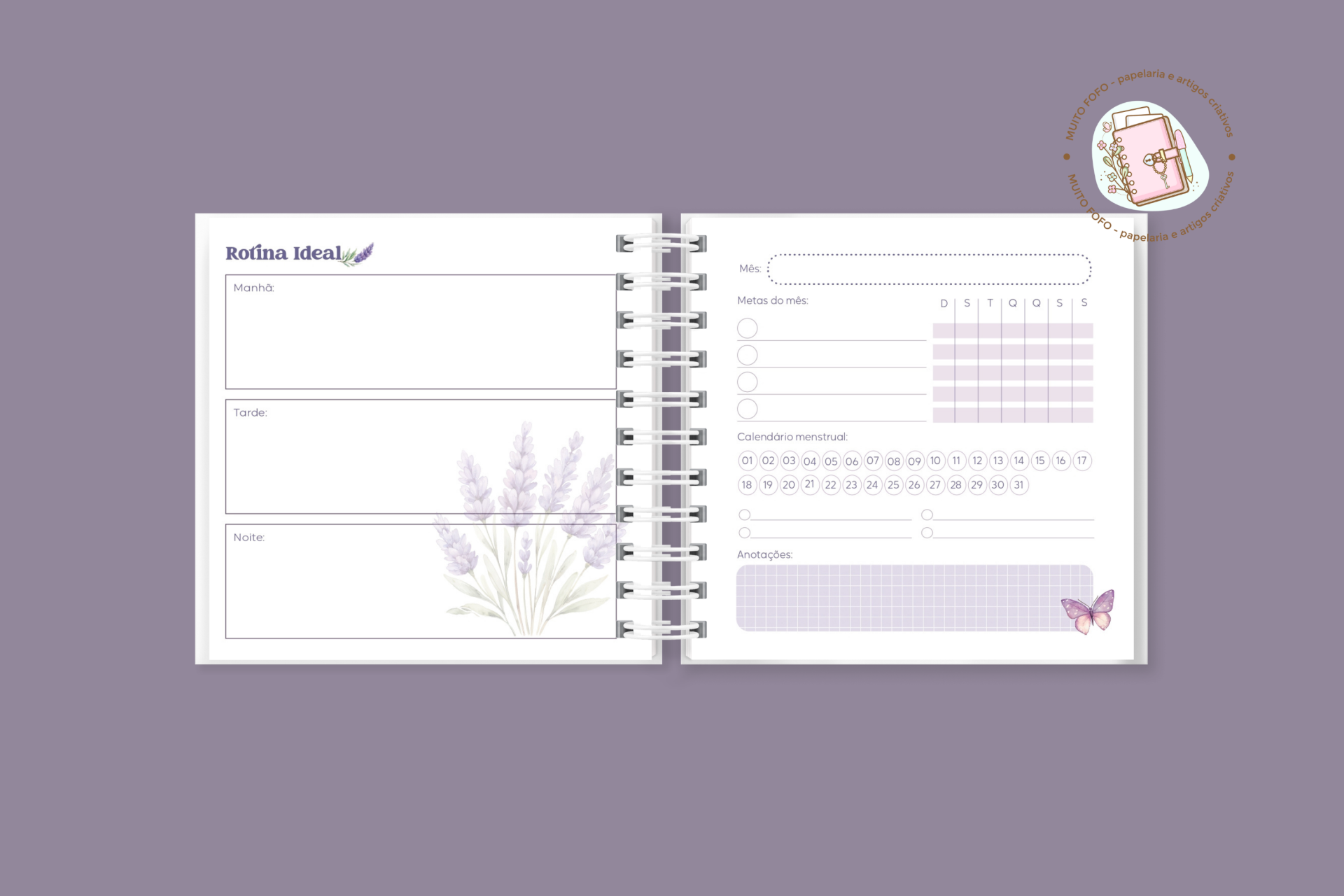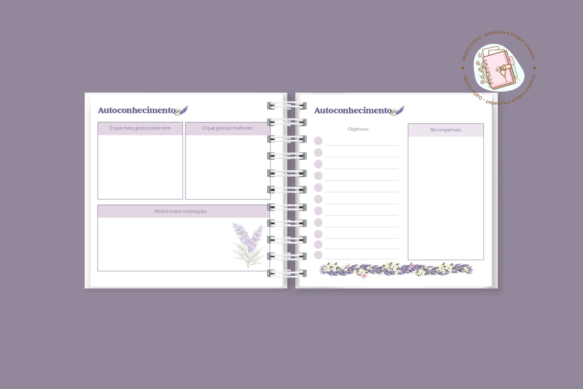 O Planner Autocuidado da Coleção Lavanda foi criado para te ajudar a cuidar de ti de forma consciente — acompanhando emoções, hábitos, saúde e evolução pessoal ao longo do tempo.