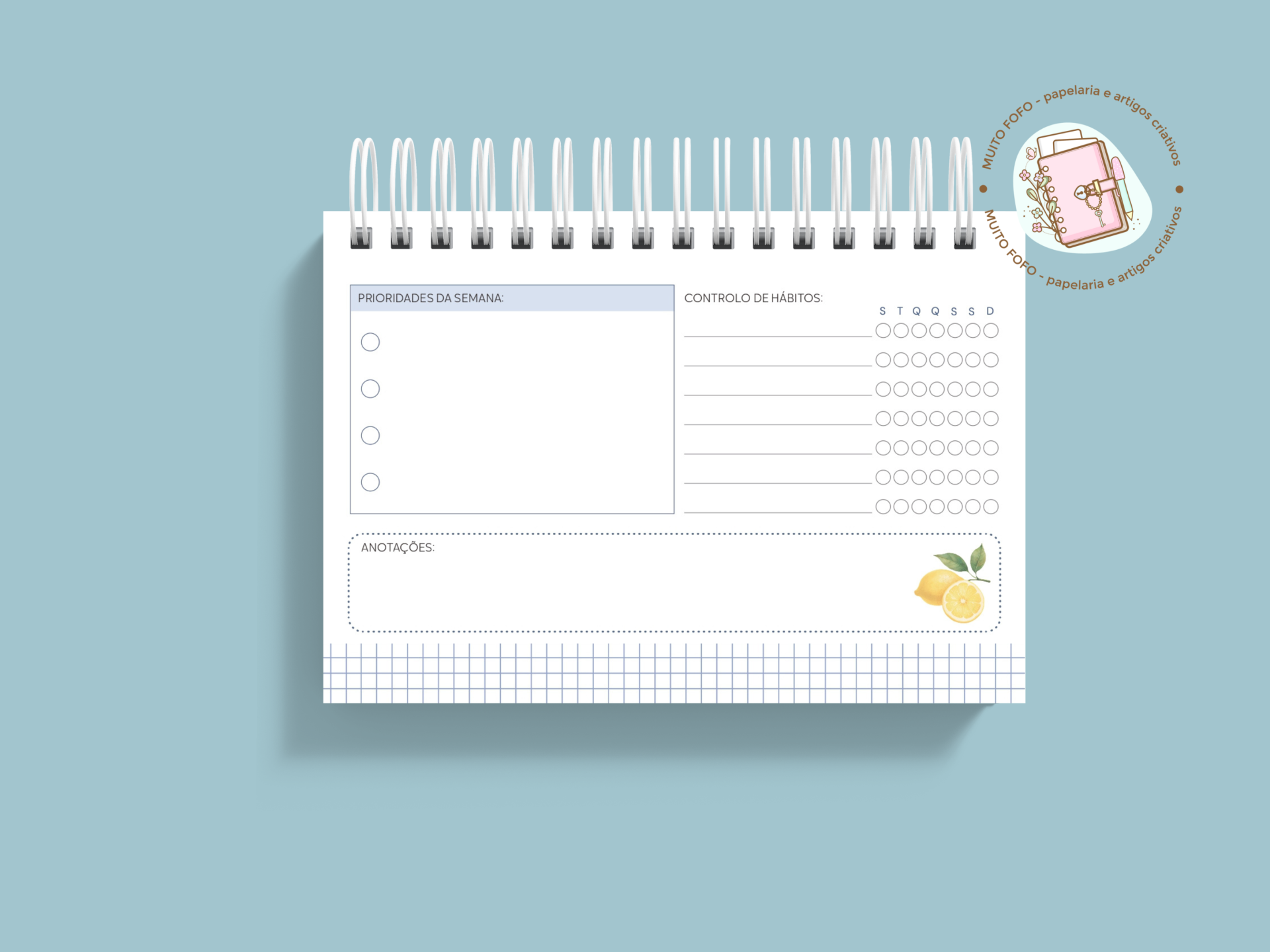 Formato A5 funcional e confortável para consultar e atualizar ao longo da semana
