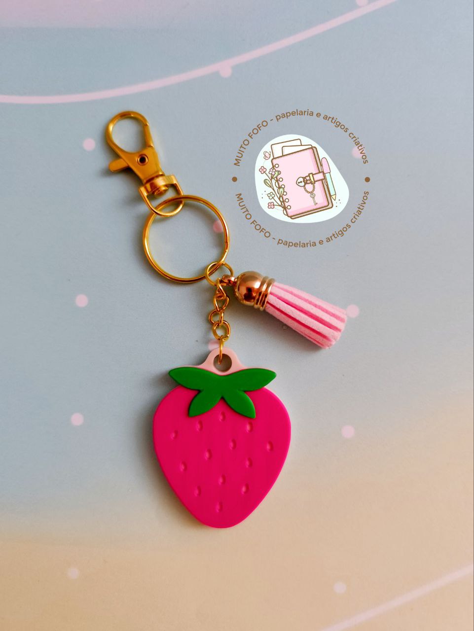 O porta-chaves moranguinho fofo em 3D cheio de estilo e com um tassel que adiciona brilho e estilo à tua mochila, chaves ou mala.